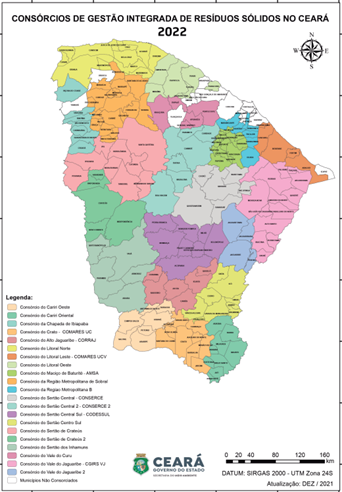Atualmente, de acordo com a Secretaria do Meio Ambiente do Ceará (SEMA), 170 municípios já aderiram à gestão consorciada e estão agrupados em 21 consórcios (conforme mapa abaixo), estando todos regularizados formalmente para implantação, criando assim, uma estrutura de pessoal e implementação do Plano de Coletas Seletivas Múltiplas.