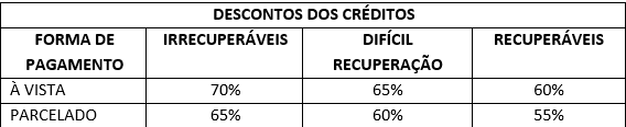 O desconto pode variar de acordo com a classificação do grau de recuperabilidade do crédito que levará em conta garantias, suspensões, parcelamentos e o tempo das inscrições dos débitos em dívida ativa.